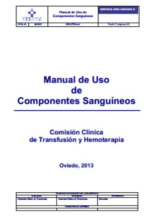 Por otro lado comparto también el Manual de Uso de Componentes Sanguíneos, publicado por la Comisión Clínica de Transfusión y Hemoterapia de la Gerencia del Departamento IV del Sevicio de Salud del Principado de Asturias, publicado en el año 2013.