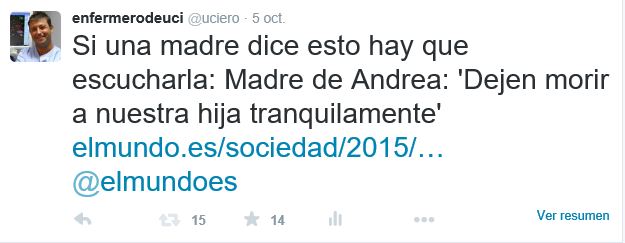 Personalmente, como padre, me resulta desgarrador pensar la situación vital que obliga a unos padres a desear la muerte de su hija, para evitar el sufrimiento que la mantiene con vida. No creo que nadie nos aproximemos siquiera a comprender el dolor de Antonio y Estela (padres de Andrea) al tomar esa decisión. Ahora bien, si una madre dice esto, al menos debemos escucharla.