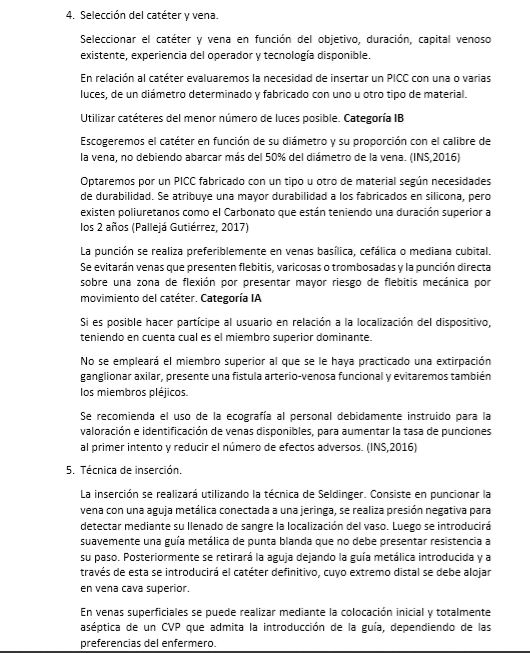 2. Cuidados de inserción y mantenimiento de CVP, CVC y PICC, y catéter arterial con referencias de GPC y artículos recientes, en los que se incluye, por ejemplo, la participación del paciente en la decisión de la implantación del PICC, evitar ocupar más del 50% del calibre de la vena con el PICC o el uso de ecógrafo por personal entrenado.