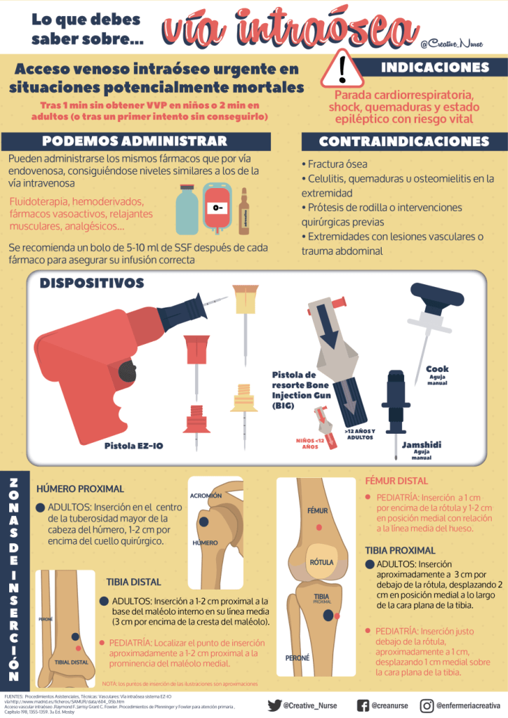Antes de todo, un poco de historia para poneros en situación, porque, aunque la vía intraósea pueda sonar a novedad, esta fue nombrada por primera vez en 1922. Fue entonces cuando se describió a la médula ósea como una vena no colapsable. ¿Qué significa esto? Que en su interior hay una gran cantidad de capilares que drenan a un seno venoso central que , ojo, ¡no se colapsa ni en situaciones se shock! Ya se puede ir intuyendo por qué me enamora está vía. En 1934 se utilizó por primera vez en humanos para hacer transfusiones sanguíneas y durante la II Guerra Mundial fue muy utilizada en los campos de batalla. Pero fue en 2005 cuando se convirtió en la segunda vía de elección ante la imposibilidad de canalización de un acceso venoso periférico en situaciones de emergencia tanto en adultos como en pacientes pediátricos según la AHA y ERC.