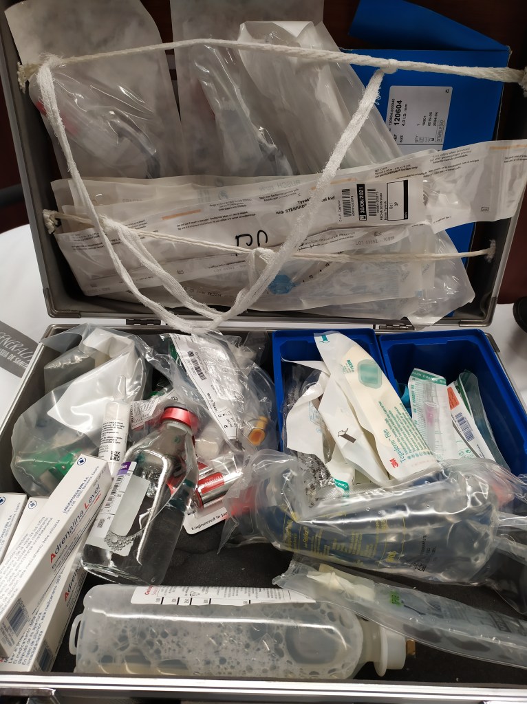 Importante disponer de lo imprescindible y saber dónde está. En ocasiones tenemos la tentación de poner todo tipo de elementos de un carro de paradas en el maletín, y olvidamos que la unidad de destino deba disponer de uno, por lo que lo realmente imprescindible es disponer de material y fármacos para el movimiento entre ambos servicios, contando que puede acaecer una PCR, ser necesario canalizar una vía de urgencia, o intubar de manera urgente.