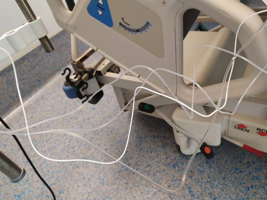 Normalmente los procedimientos no duran más de 30 minutos, por lo que podemos suspender aquellas perfusiones que nos vayan a dificultar el movimiento y la gestión física del paciente en radiología, por ejemplo Nutrición Parenteral. También debemos tener en consideración que el cuerpo de nuestro paciente tendrá que entrar en la máquina del TAC para la exploración, dejando las bombas en el exterior, por lo que necesitaremos suficiente longitud del sistema para que no se produzcan tirones.