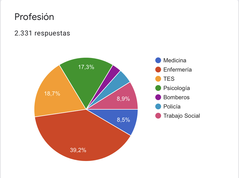 Los porcentajes de participación más altos se correspondieron con los profesionales de la enfermería (39,2%) y los técnicos de emergencias sanitarias (18,7%). Algo por debajo de éstos, los profesionales de la psicología representaron el 17,3% de la muestra, seguido de los trabajadores sociales (8,9%) y los médicos con un 8,5%. El 7,2% restante se distribuyó entre policías (4,4%) y bomberos (2,7%) .