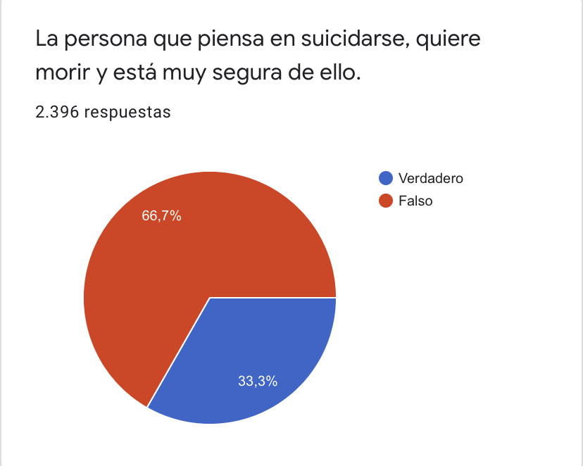 Un segundo dato llamativo de la encuesta referida tiene que ver con la creencia de que “La persona que piensa en suicidarse, quiere morir y está muy segura de ello”, (Gráfica 3). En este supuesto, el 33,3% de la muestra, afirmaba la veracidad del postulado. Como corolario necesario se atribuye cierta inevitabilidad del acto suicida, y se desestiman la ambivalencia e inseguridad habituales.