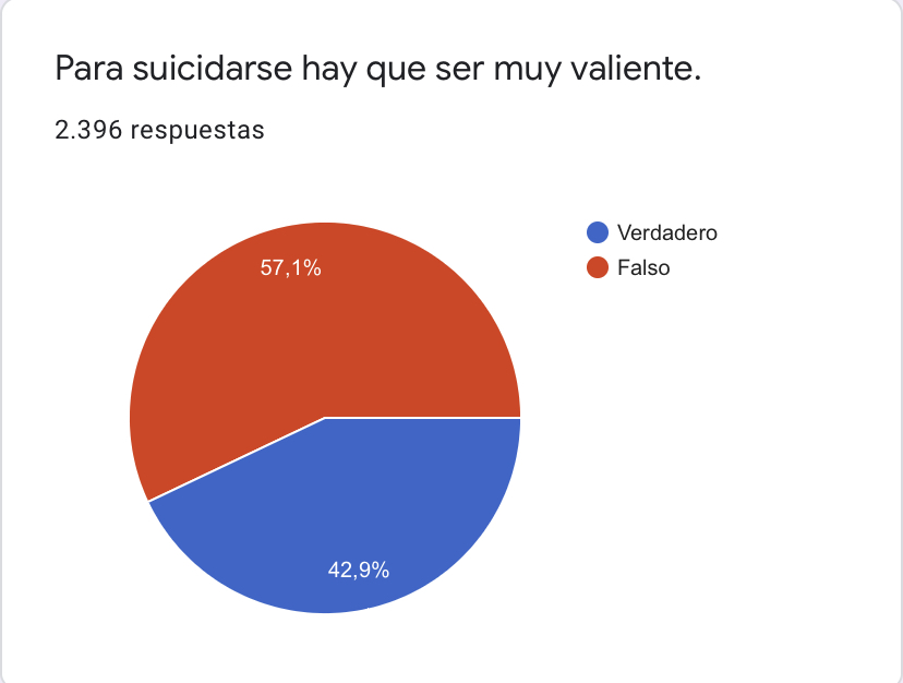 El dilema suicida se sitúa entre el miedo a la vida, y el miedo a la muerte. La persona sólo pretende dejar de sufrir, dejar atrás un sufrimiento que vive como insoportable, por encima de todos los niveles de tolerancia, interminable, sin plazo de finalización, ante el que ha perdido la mas mínima expresión de esperanza y del que no sabe, ni puede escapar. Pero siendo esto cierto, también lo es el miedo a morir, al proceso, a la incertidumbre del éxito. No en vano solo uno de cada diez-veinte intentos termina en suicidio consumado (10) Finalmente el tercer mito que arrojó datos inquietantes es que enuncia que “Para suicidarse hay que ser muy valiente” (Gráfica 4). El 42,9% de la muestra validó esta afirmación. Como consecuencia se hace la atribución del suicidio a una característica estable y permanente de la personalidad, y lo que es más peligroso todavía: a un rasgo que se considera deseable, e incluso imitable por parte de otros. Lejos de ser algo reservado a esa población exclusiva de “valientes”, la literatura sobre suicidología pone de manifiesto que el riesgo suicida es mucho más universal, cotidiano, y a la vez desconocido, ya que “el 50% de la población general (no clínica), experimentará tendencias suicidas moderadas-severas, a lo largo de su vida” (11).