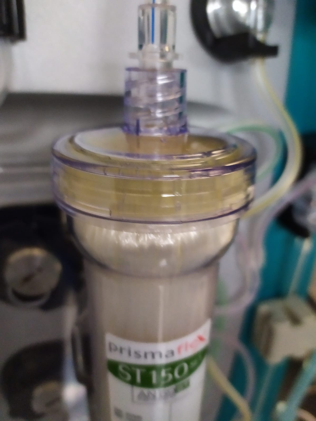 Es muy importante comprobar que disponemos junto a la maquina de hemofiltro (generalmente colgado en un asa lateral) un suero limpio para, en caso necesario, proceder a la devolución de la sangre al paciente. En nuestra unidad, por sistema, se prepara junto con el purgado del equipo.