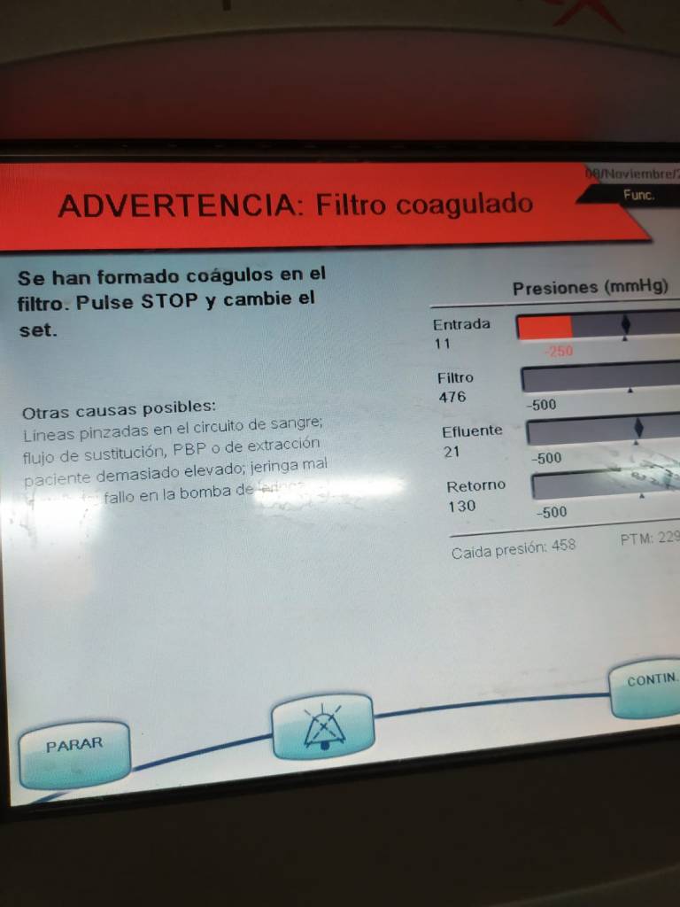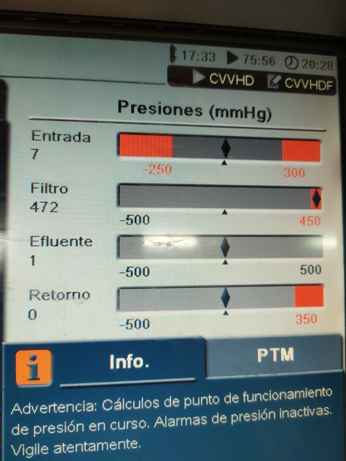 Estas dos cifras y su evolución en las horas anteriores nos darán una aproximación del estado de coagulación y saturación del filtro. Con cifras elevadas podemos ir pensando en retornar la sangre antes de que la propia máquina nos indique que el filtro está coagulado y no permita retornar.
