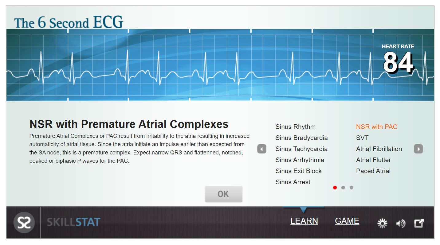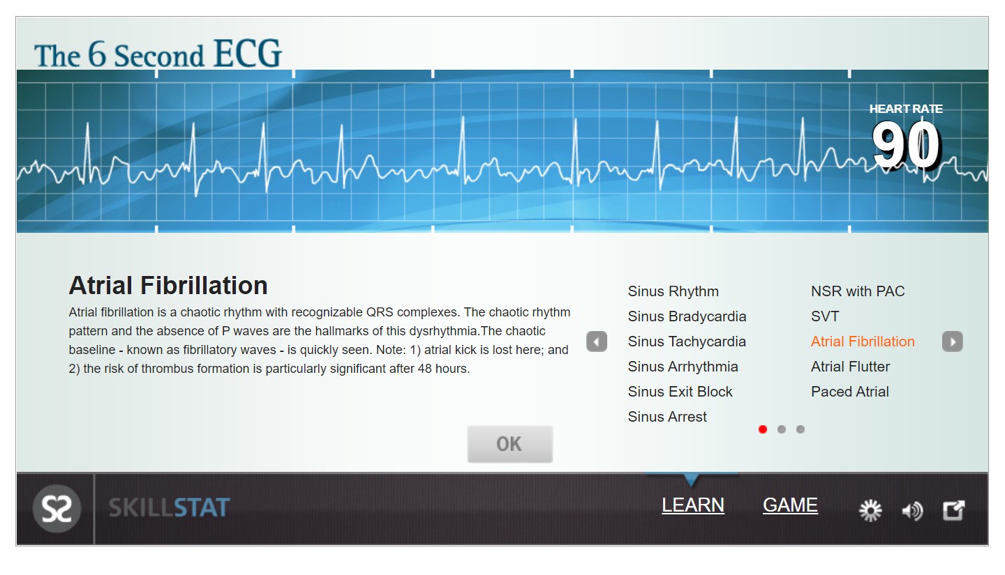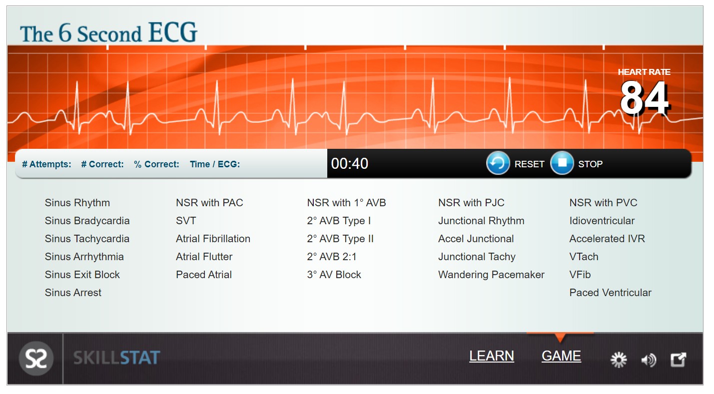 Hoy os traigo un nuevo recurso que además contiene un juego donde practicar el reconocimiento de las diferentes arritmias cardiacas en un minuto alojado en la web SKILLSTAT…