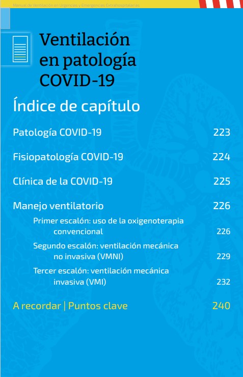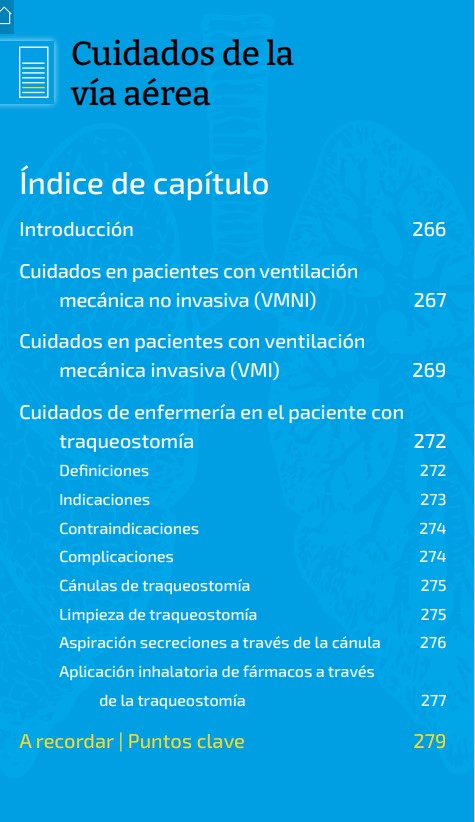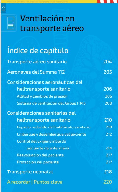 Dentro del Manual existen, además, capítulos específicos muy interesantes, como la Ventilación mecánica en transporte aéreo, la adaptación de ésta al paciente COVID, o los cuidados de enfermería en pacientes con VMI, VMNI y paciente con traqueo.