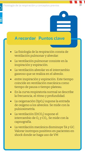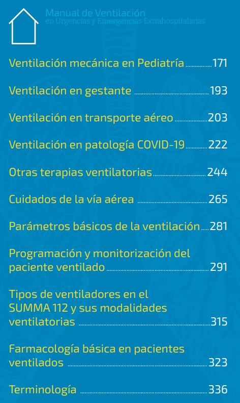 Se trata de un muy buen recurso que aborda la Ventilación mecánica desde la perspectiva de la atención extrahospitalaria, iniciando con las bases anatomofisiológicas y las modalidades de VM tanto invasiva como no invasiva, y deteniéndose posteriormente en la patología más habitual en entorno SUMMA.