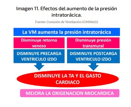 En el manual abundan las infografías donde, por ejemplo, se explica de manera muy clara las repercusiones en la hemodinámica del paciente del aumento de presión intratorácica debida a la VM.