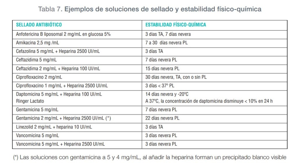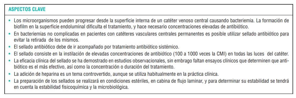 Medicamentos utilizados en el sellado: actualmente existen pocas guías clínicas con recomendaciones claras sobre los medicamentos utilizados en el sellado, debido a la falta de evidencia científica por la carencia de ensayos clínicos, y por ello se basan en opiniones de expertos. El sellado de catéter se acompañará siempre de tratamiento sistémico, teniendo en cuenta que el paciente no presente hipersensibilidad al antibiótico. En la bibliografía se describen los antibióticos utilizados más frecuentemente en el sellado antibiótico son los siguientes: