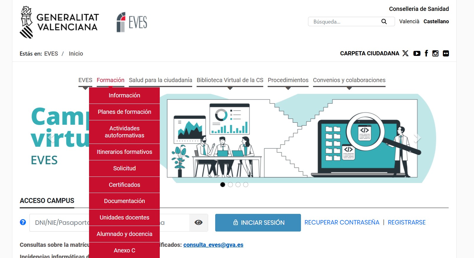 Se accede a estos programas desde la propia página web de la EVES , en la pestaña «FORMACION» y haciendo click en «ITINERARIOS FORMATIVOS» en el desplegable.