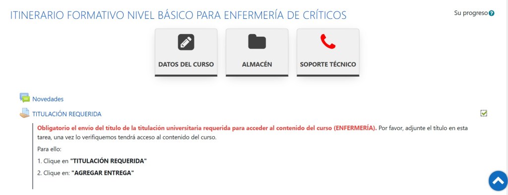 El curso tiene un apartado de ALMACEN donde descargar todo el material en PDF (la navegación por el aula virtual es intuitiva pero algo tediosa), y está actualizada a Marzo de 2024. También es obligatorio subir la titulación de Enfermera para matricularse y acceder al contenido del curso.